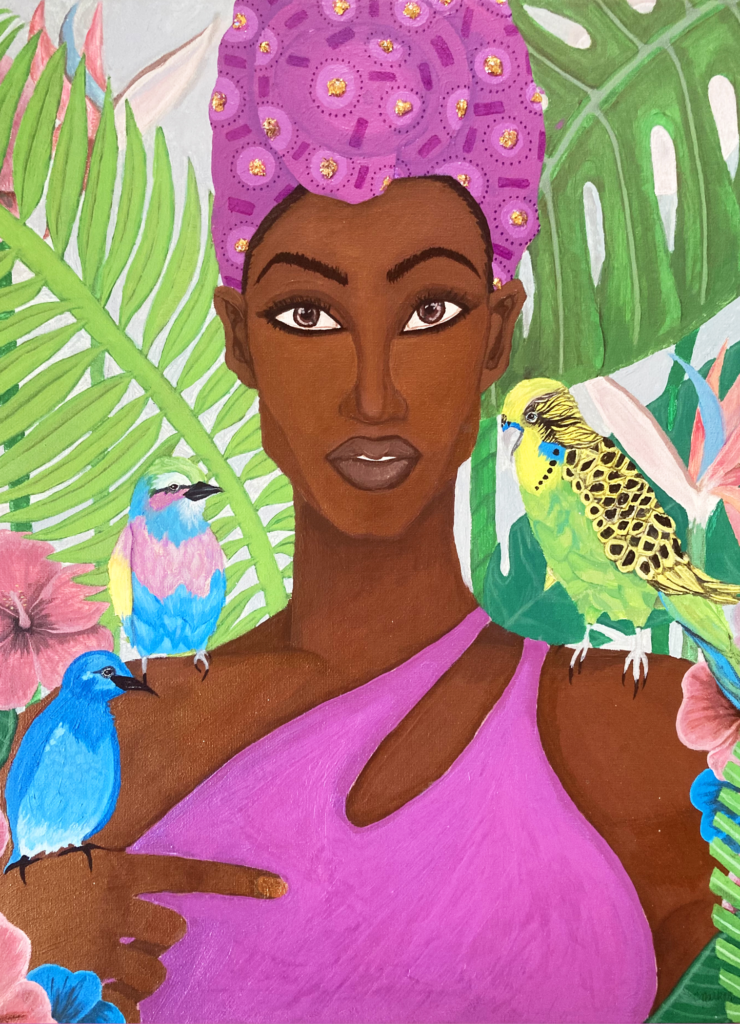 The first piece of this series highlights the first stage of the healing journey, which is the realization that healing needs to take place. The birds in the piece are messengers. The lilac-breasted roller symbolizes hard work in its culture for its unique hunting style. Parakeets are renowned for their strong ability to communicate. Bluebirds symbolize good news on the horizon. The name Sheba means “daughter of a promise”. While healing, it is important to remember the promise over your life. And as you are working towards wholeness, remember the importance of hard work, healthy communication and the promise that good things are on the way. Sheba is here offered as a large 24"x36" (2ft x 3ft) canvas print, ready to hang wherever your heart desires.