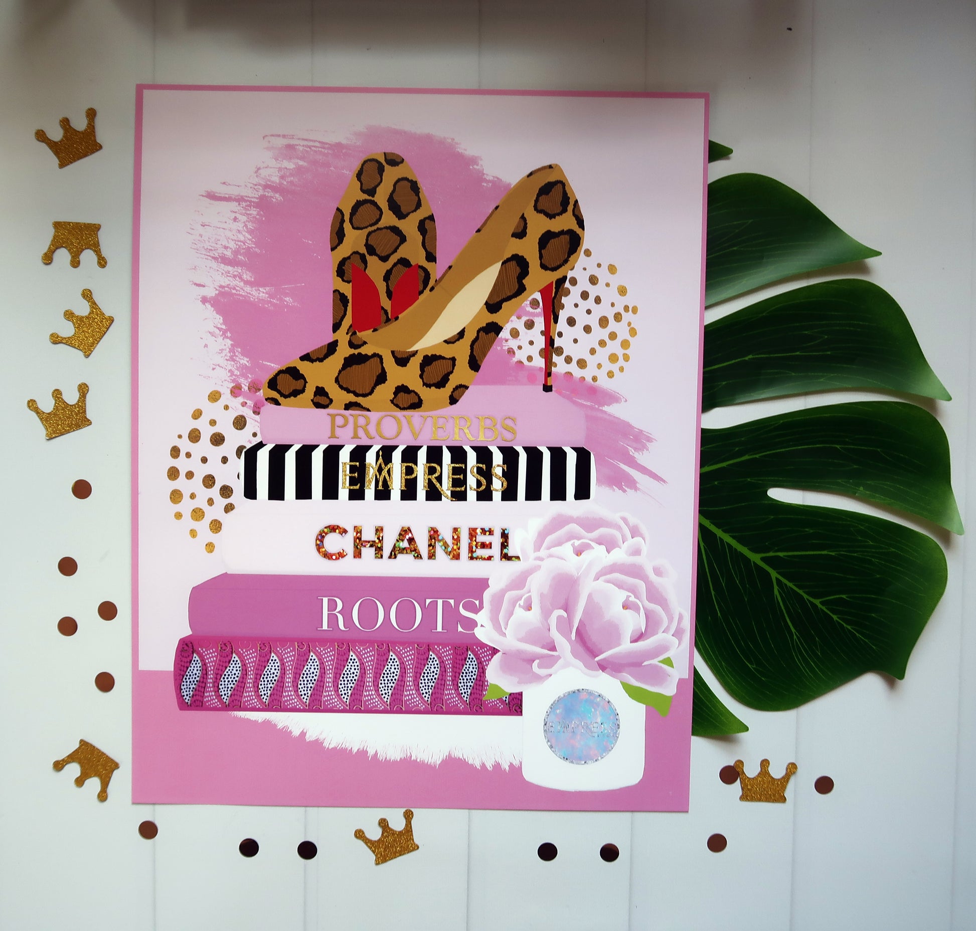 The first (digital) painting in this series features vibrant shades of pink. The book at the base of the stack is covered with Ankara fabric, which is here representative of the foundational element of knowing where you come from as this is a major part of wisdom. Layered atop, and echoing that, is the book "Roots". The next book, "Chanel" has a double meaning. It is emblematic of luxury, but also the etymology of the word "Chanel" means "channel". Wisdom is often channeled into our lives from various sources and our original Source. The next book, "Empress", represents the artist's business, but also serves as a reminder that the viewer should prioritize their business to be wise. The wisdom book of Proverbs rounds out the stack. The leopard pumps at the top are a reminder to operationalize the wisdom one gathers by applying it in one's daily "walk". Proverbs is here displayed on the largest paper print that we carry. This 11"x14" size is printed on semi-gloss 100lb cover stock paper that is thick enough to stand on its own, but still thin enough to frame.